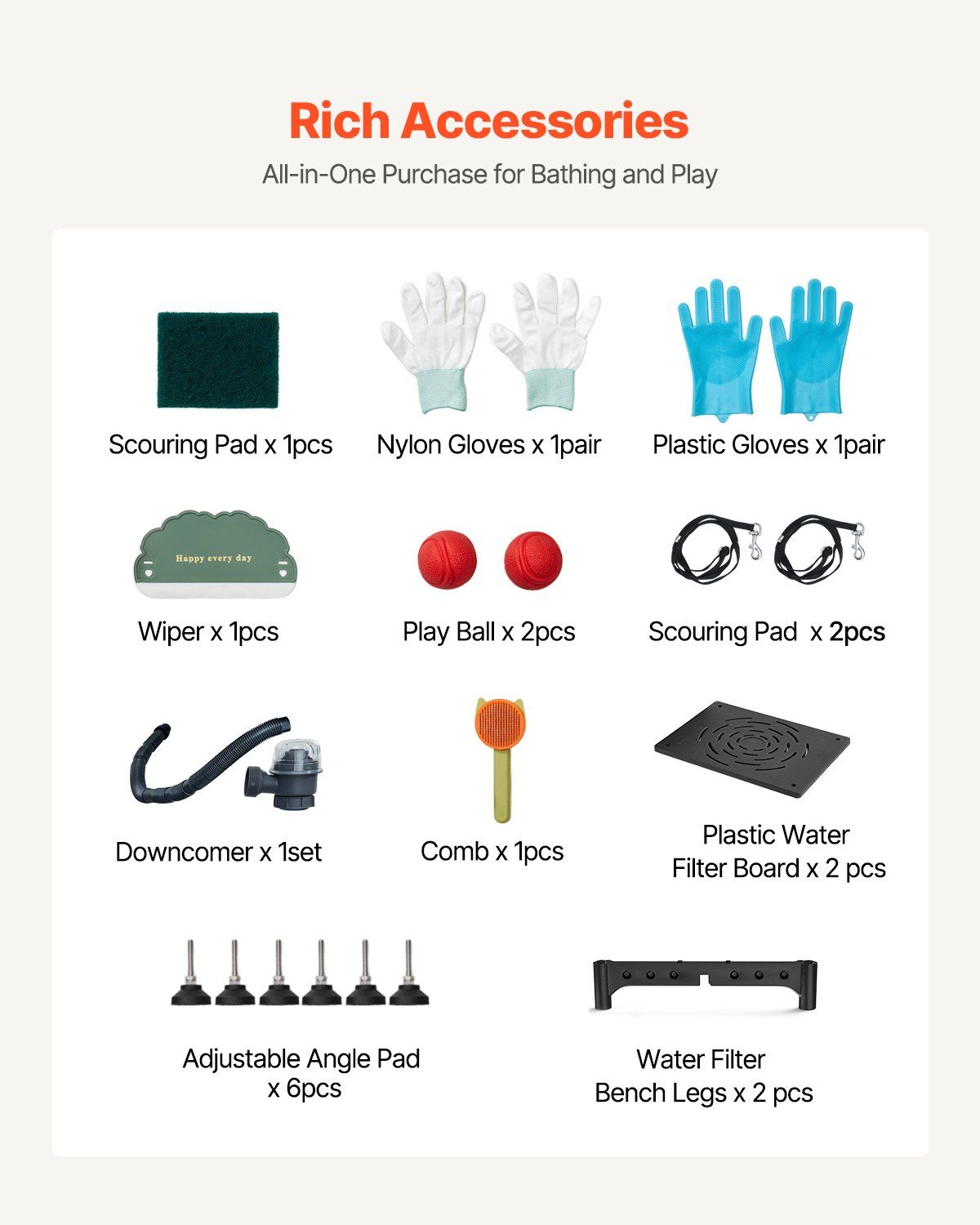 5.Complete Accessories: This dog wash station comes with a showerhead, faucet, and a direct connection to a home hose, built for durability. It also includes a cleaning cloth, squeegee, brush, and gloves, ensuring your pet enjoys the full bathing experience