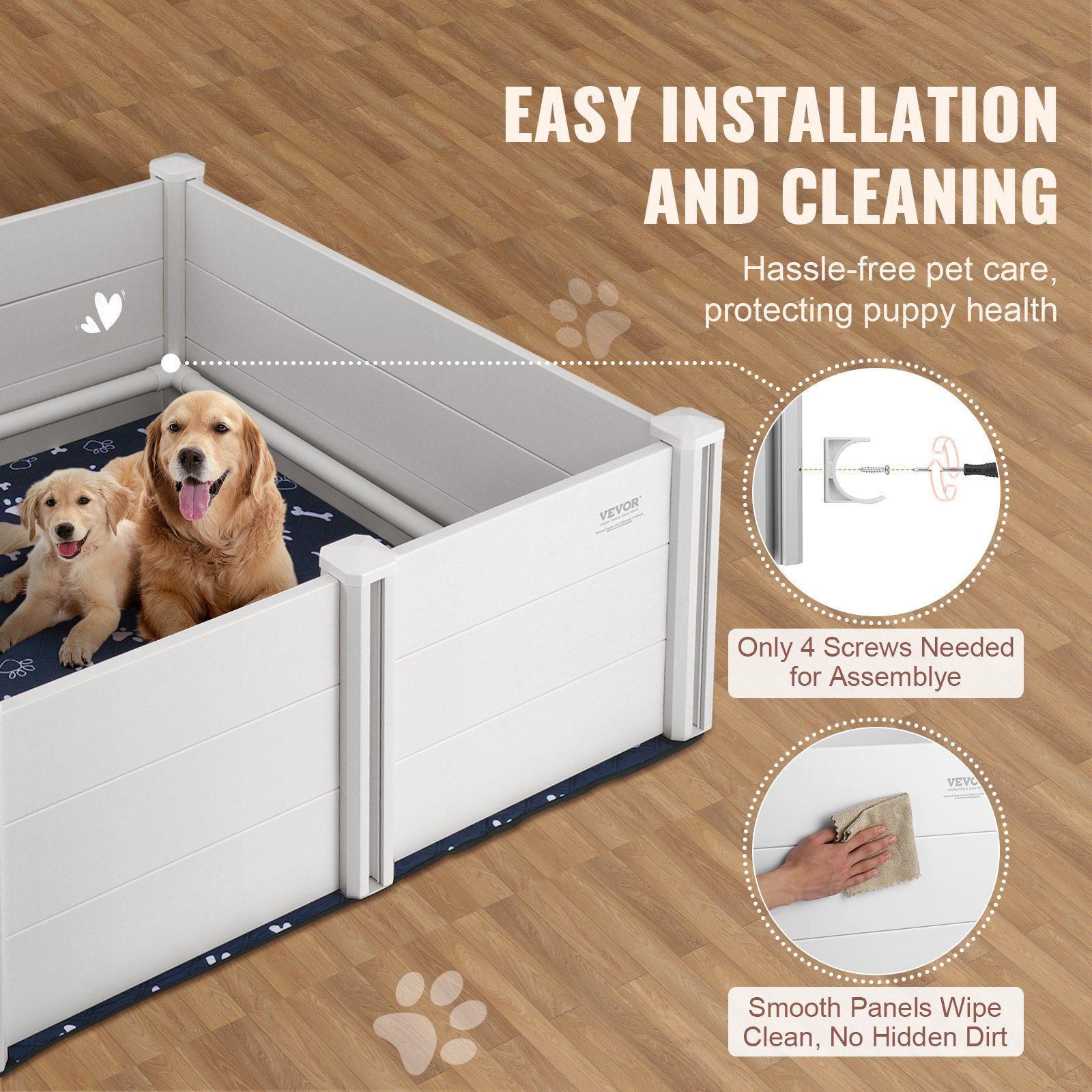 Assembly is as simple as following the instructions in the manual—just snap the panels together and secure them with the four screws provided. Cleaning is just as easy; the smooth walls can be wiped clean, keeping the whelping box fresh for dogs with minimal effort.