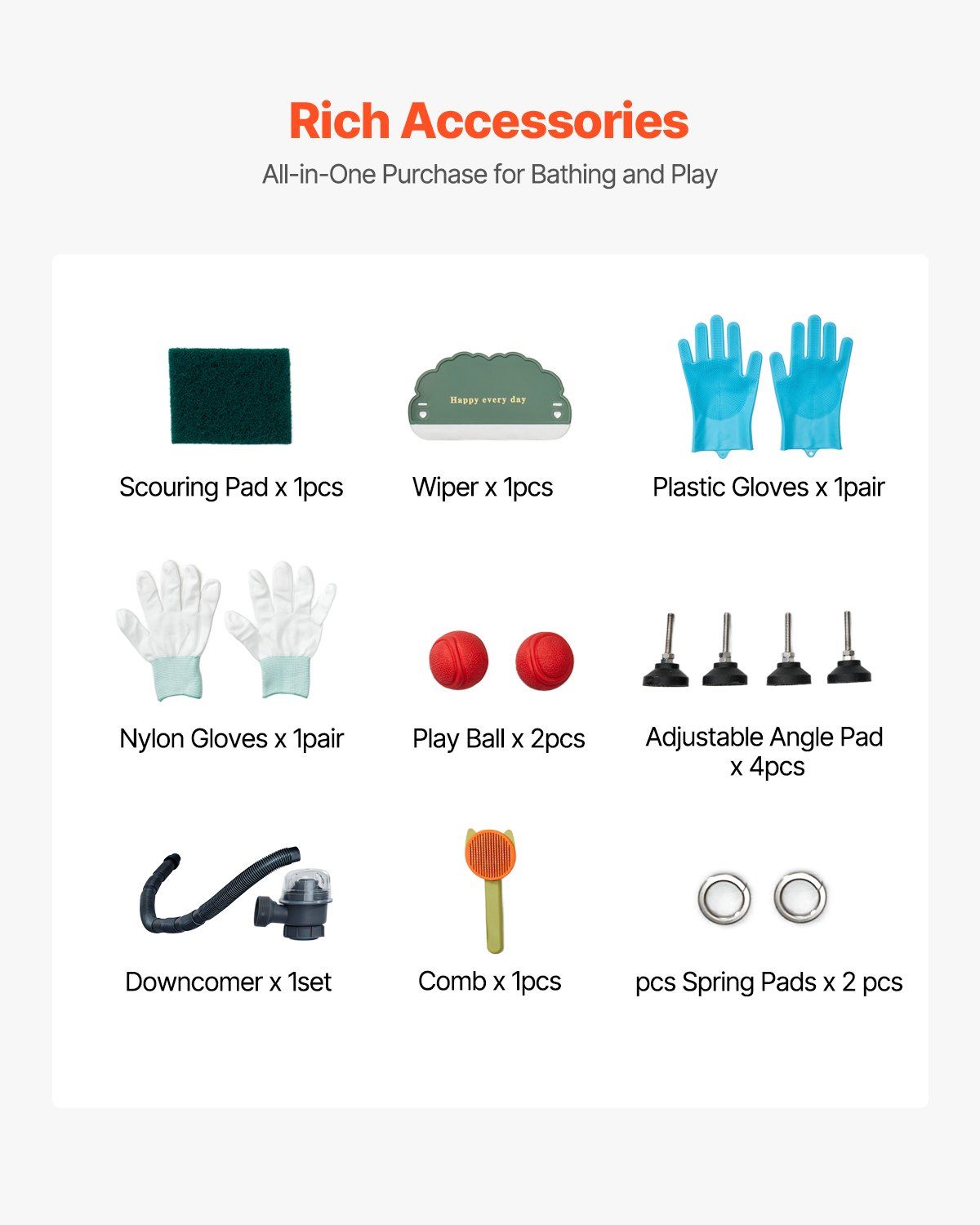 5.Complete Accessories: The pet washing sink comes with a showerhead, faucet, and a direct connection to a home hose for durability. It also includes a cleaning cloth, squeegee, play ball, brush, and gloves, ensuring your pet enjoys the full bathing experience