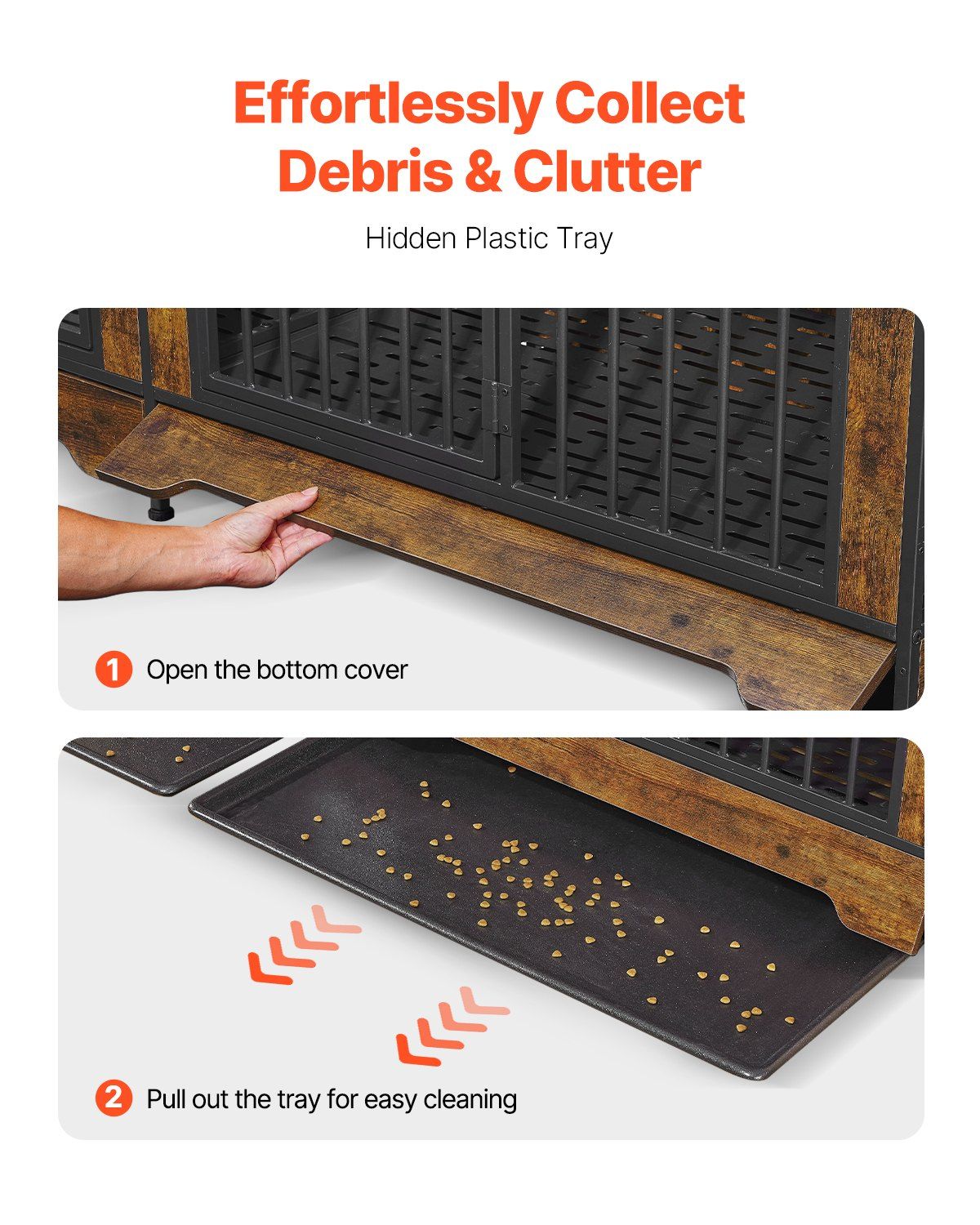 4.Tray Design: This dog crate furniture large breeds comes with two hidden trays at the bottom to catch debris, fur, and dirt. Simply open the cover to remove and clean, keeping your pet's area tidy without dirtying the floor.